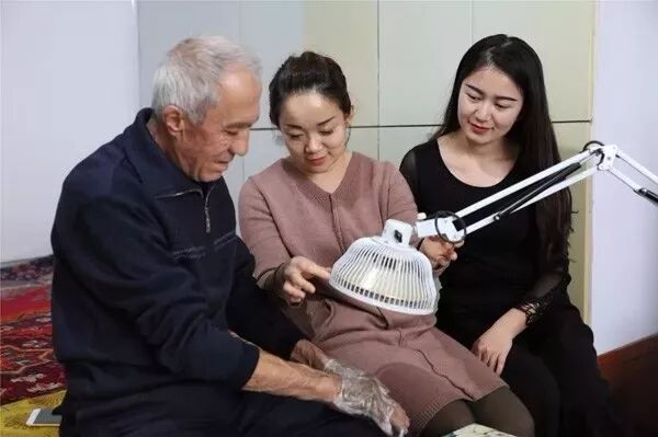2017年12月23日,马海燕(中)指导哈的(左一)使用烤电治疗仪。