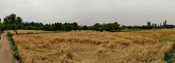 我来到树下,一边看着他们熟稔的收割着麦子,一边用帽子扇风,掏出了自己的水杯开始喝水。刚喝了一两口,看到田埂上杏子已经成熟,女主人摘了一些杏子给我们吃,杏子品种是阿拉玛村特有的黄杏,杏子不大,但入口绵甜,余味还有些酸爽,很适口好吃。当天我们收割了将近三个小时的麦子,到太阳西斜时才离去,汗水湿透了衣衫,但是我们确实体会到了古诗中“锄禾日当午,汗滴禾下土”的意境。这次第一次收麦的经历,虽然有些小艰辛,但也有些小收获,必将成为我们今年“访惠聚”工作中难忘的一页。