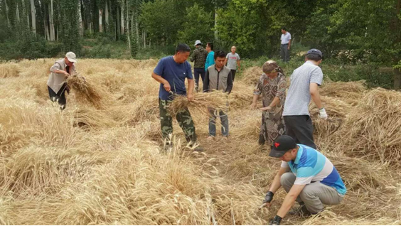 我是城市里长大的孩子,我的父亲是一名货车司机,我对小麦的认识甚至于不如对汽车的。在很小的时候,我就拥有了父亲用钢珠镶嵌在汽车引擎组件上制作的的陀螺。但是初识小麦,却是在后来快成年时在外地上学,从农田经过时见到依然翠绿的冬小麦,当时很纳闷这里的韭菜怎么长的这么高?曾因此被来自农村的同学们嘲笑过。来到阿拉玛村住村后以来,从春节后初来时看到正在返青的冬小麦,到住村一百天后看到小麦成熟后变成一片橘黄,我才终于得以目睹小麦这种农作物的完整生长过程。后来我爱上了文学,认真研读过很多当代作家的诗歌,其中就有来自“北大三杰”之一的海子那首《麦子熟了》,小麦在这位来自农村的诗人心目中是很独特的意象,麦田和麦子就是他童年无邪天真生活的写照。而像农夫一样在自己的田地里辛勤劳作,“面朝大海,春暖花开”是他心目中的人生理想之一。至于对麦田的印象,最初是读美国作家杰罗姆?大卫?塞林格的小说《麦田守望者》时的那一句话:“我将来要当一名麦田里的守望者。有那么一群孩子在一大块麦田里玩。几千几万的小孩子,附近没有一个大人,我就在那悬崖边,我的职务就是在那儿守望。”当时我还很纳闷,麦田有那么好玩吗?至于整天呆在那里玩儿吗?在看法国电影《梵高传》时得知,著名印象派画家文森特?梵高非常热爱麦田,他一生中一共绘制了近50幅涉及麦田的绘画作品。我一一浏览过这些图画,非常喜欢那副《阳光下的麦田收割者》,在蔚蓝色的天空下,是金黄色翻滚着的麦浪,在画面一角,有一位埋头耕作的农夫正在挥镰收割。这是一幅很美丽的图画,把麦田收割刻画的如此惟妙惟肖,也是他美好心灵的真实写照。因此,住村110天后,我们一起去为村里的一位贫困户收割夏麦时,我也很想体验一下麦田收割的意境,虽然当时是下午5点,日头依然毒辣。我们帮助收割的这家是因为儿媳生病住院,儿子去照顾,因而收割季节家里无劳动力,只有老两口与尚不具备劳动能力的孙子。驱车到了田边,农户女主人已经在地头等着我们了。她准备了许多把镰刀,大家各自挑选了一把趁手的,把裤腿塞进袜子里,就开始收割起来。