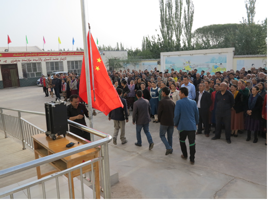 村党支部书记艾热提?买买提为全村村民就新中国成立的历史,对全体村民进行了热爱祖国、热爱党、维护统一、反对分裂的爱国主义教育。当四名护旗民兵将五星红旗护送到旗杆下,在场的全体村民和村干部、住村干部等几百人男女老幼一同唱起了国歌。在大家放声齐唱的歌声里,五星红旗冉冉升起。