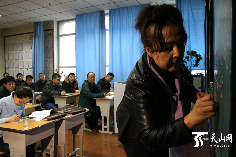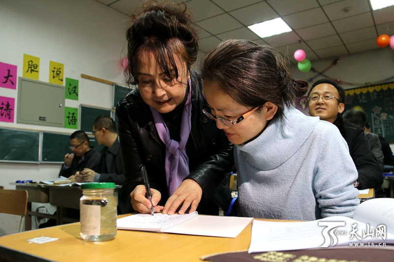 教师正在给“访惠聚”驻村工作队中不懂双语的干部进行双语培训。