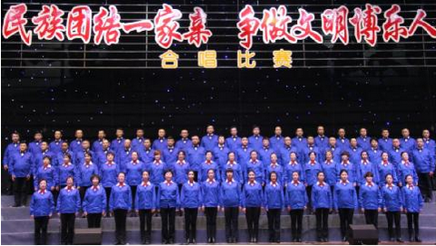 “五十六个民族,五十六朵花,五十六族兄弟姐妹是一家”,“前进,向前进,向着胜利的方向”,熟悉的歌词,铿锵的节奏,让人热血沸腾,不同的面孔,相同的情怀,民族团结一家亲。