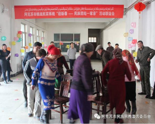 为进一步贯彻第九次党代会、“1·7”自治区陈全国书记讲话及地区扩大会议精神,深入推进“民族团结一家亲活动”,1月19日,阿克苏市统战民宗系统干部在市伊协开展2017年“迎新春·民族团结一家亲”联谊活动,市委统战部、市民宗委、伊协全体党员、干部、职工及结对子亲戚、结对贫困户,市委统战部、市民宗委退休老党员、老干部代表总共120余人参加了活动。