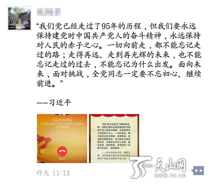 ??? 天山网讯(记者王娜报道)7月3日,中国共产党95华诞虽然已经过去了2天,新疆人的朋友圈里却依然党旗飘扬,习近平总书记在庆祝中国共产党成立95周年大会上的讲话依然回声嘹亮。三天来,各族群众在网络上抄党章、颂党恩,为党庆生热情不减。