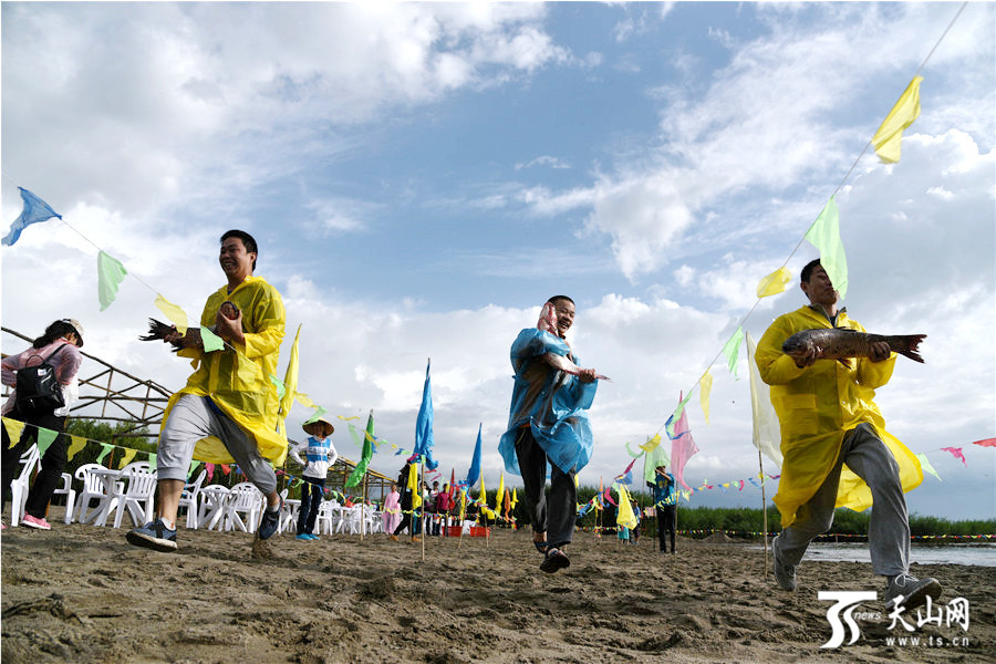 捕鱼节上举行抱鱼接力比赛,趣味横生。
