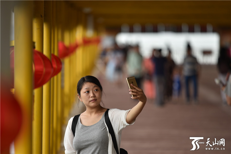 一位游客在博斯腾湖大河口(西海渔村)景区自拍。