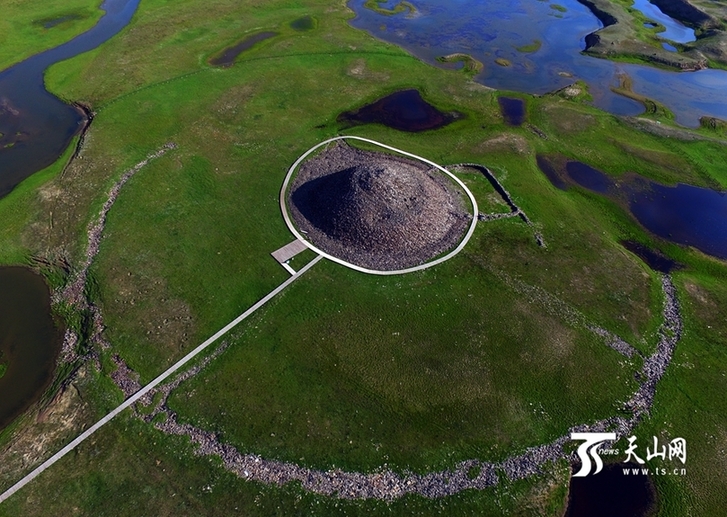 图为矗立在三道海子入口花海子畔的神秘大石堆。青河三道海子大石堆的独目人传说,哈巴河托干拜2号墓地中出现的心形人面像,阿勒泰市汗德尕特乡的墩德布拉克河谷“脚踏雪板”的岩画,这些都是陈列在阿勒泰这个会客厅中的稀世珍宝。
