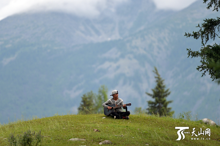 在喀纳斯村,巴图·吾勒扎一个人爬到屋后的山坡上,抱着吉他,盘坐,闭眼弹唱图瓦民谣。