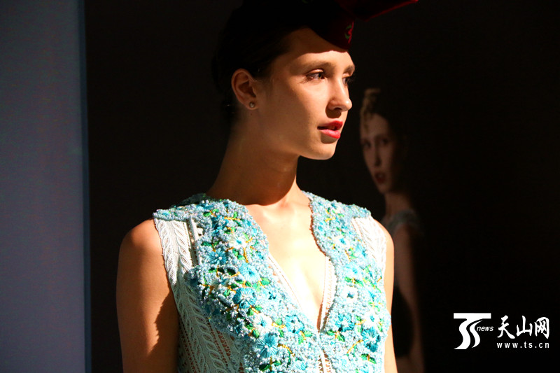 天山网哈密讯(记者孙健摄影报道)8月17日,新疆哈密木卡姆传承中心,模特身着曾在七月巴黎时装周上亮相的、腰间绣制着维吾尔族传统刺绣的时装首秀哈密。在哈密绣娘热娜古丽?素批看来,这一切都超越了时间与空间的束缚。