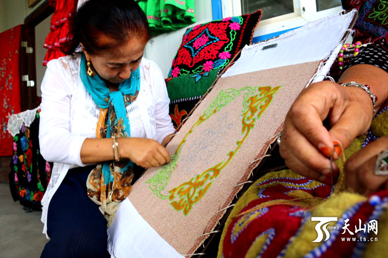 “仅在小泉子村就有26个绣娘跟我学刺绣,最小的18岁,最大的54岁。”热娜古丽?素批说,2013年6月,她成立了刺绣合作社。她开始带徒弟,带动周围的家庭妇女一起走向致富道路。