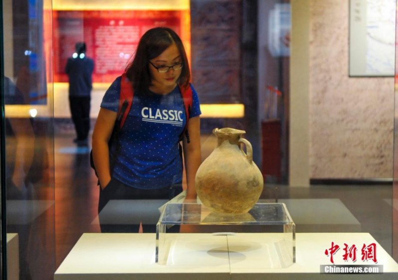 9月18日,作为第五届亚欧博览会——中外文化展示周的重要内容之一,《丝路于阗——文化与艺术的交融:新疆古代和田艺术精品文物展》在新疆博物馆展出。据介绍,本次展览从生产生活、纺织技艺、造像工艺三个方面,汇聚了新疆和田地区出土的近217件/组精品文物,包括陶质、木质生活用品、钱币、纺织品、壁画、木简木牍、雕塑造像等,形象地描绘了世界四大文明在和田交流融汇的历史轨迹,展示了和田所承载的厚重历史文化底蕴。图为和田地区出土的汉代“三猴玉鸟纹黄釉盘口陶壶”。刘新 摄