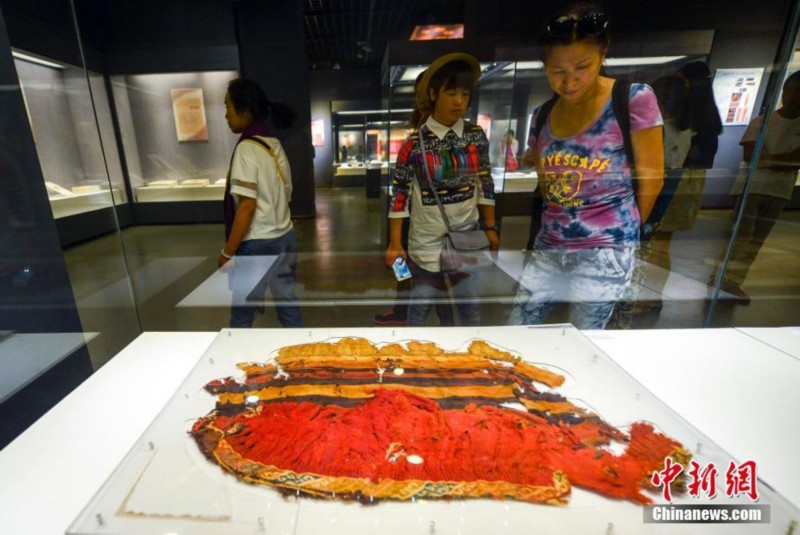 9月18日,作为第五届亚欧博览会——中外文化展示周的重要内容之一,《丝路于阗——文化与艺术的交融:新疆古代和田艺术精品文物展》在新疆博物馆展出。据介绍,本次展览从生产生活、纺织技艺、造像工艺三个方面,汇聚了新疆和田地区出土的近217件/组精品文物,包括陶质、木质生活用品、钱币、纺织品、壁画、木简木牍、雕塑造像等,形象地描绘了世界四大文明在和田交流融汇的历史轨迹,展示了和田所承载的厚重历史文化底蕴。图为和田出土的“勾连纹缀织裙”。刘新 摄
