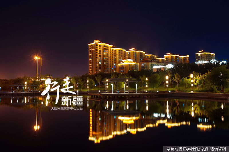 ??经过几年的不断改造,昌吉市生态型、田园式的休闲景观公园不断增加,给城市增添了新的活力与品位。图为昌吉市滨湖河北岸的夜景。 骆俊旭 摄