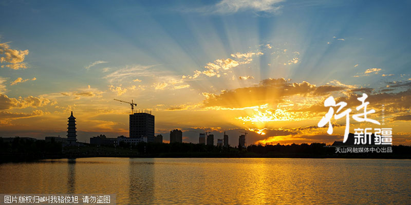 ??小雨后,昌吉市蓝天白云微风,金色的阳光漫透湖面。在城市的年轮中,昌吉市坐拥绿地,城区绿化次第“换妆”,童话般美丽的四季让人回味悠长。骆俊旭 摄