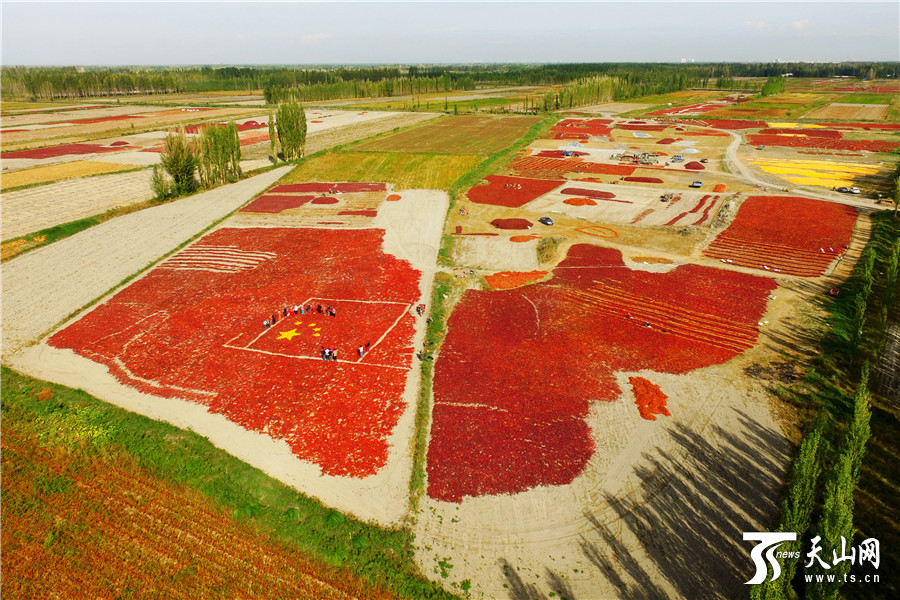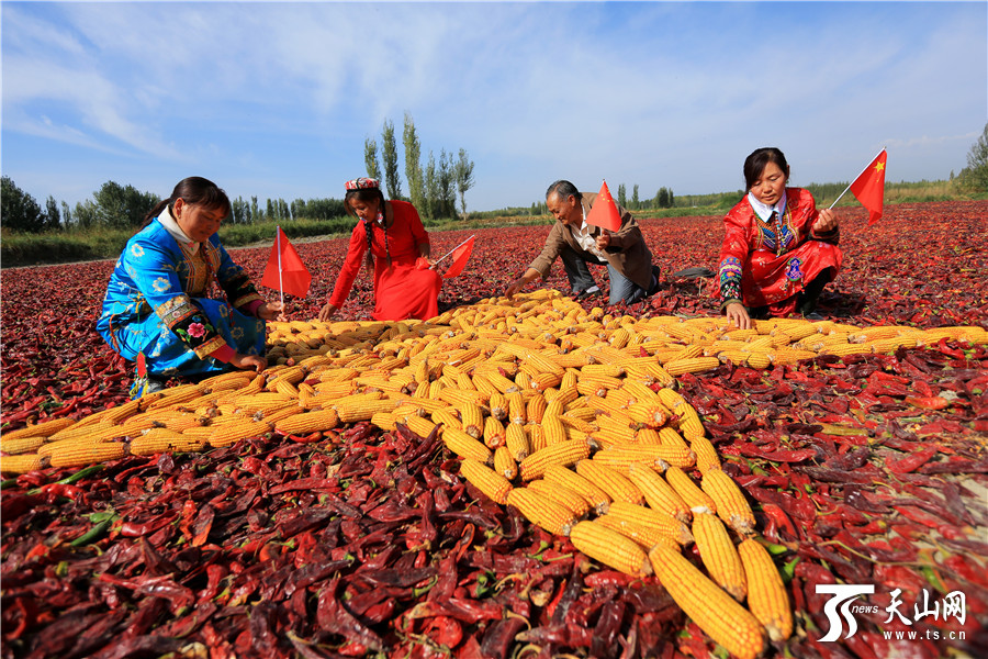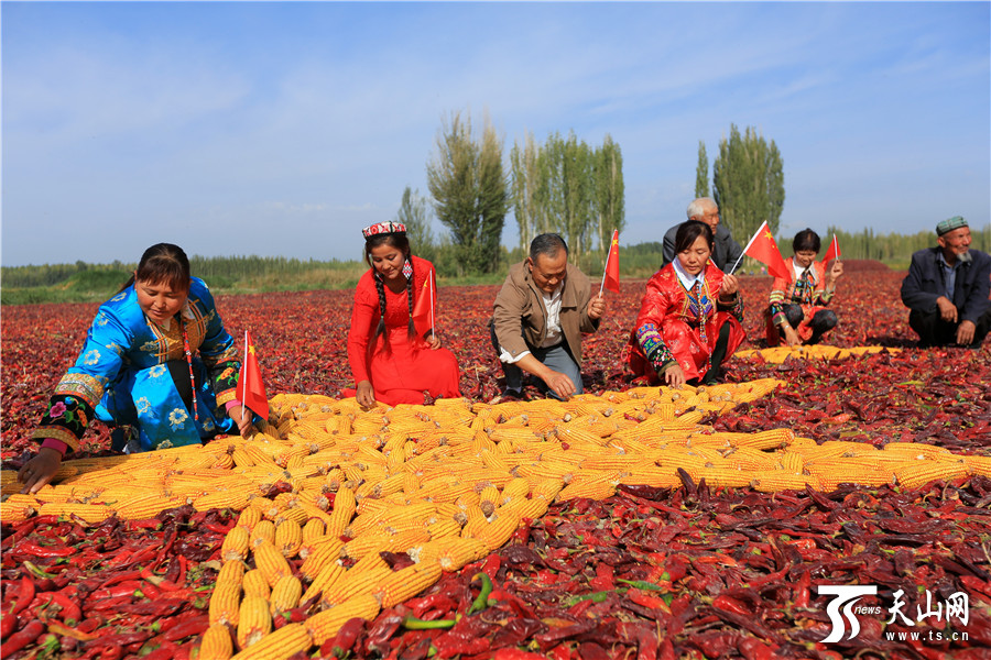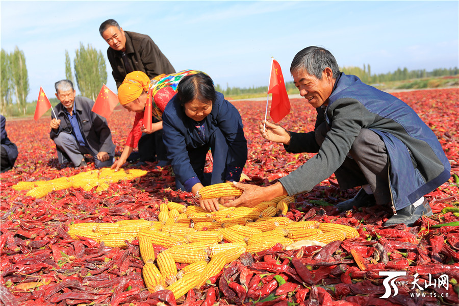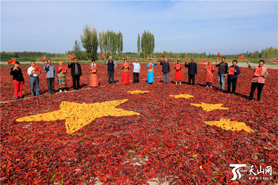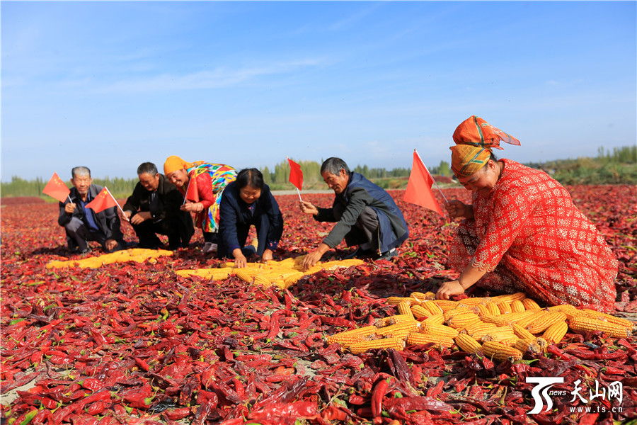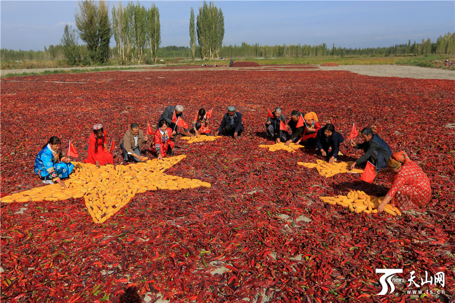 天山网讯(通讯员年磊 范梦玲摄影报道)在新疆博湖县才坎诺尔乡才坎诺尔村晾晒场上,来自该村的各族农牧民群众团聚在一起,用丰收的辣椒、玉米等庄家拼成一副别样壮美的五星红旗,喜迎祖国67华诞,以晒秋的方式表达他们对祖国热爱之情。