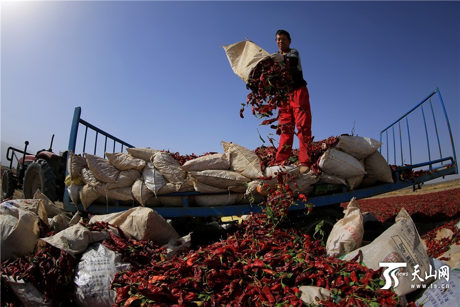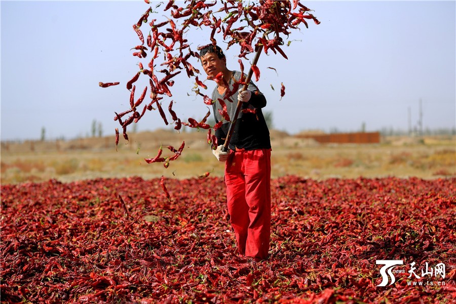 10月8日,在新疆博湖县博斯腾湖乡库代力克村晾晒场上,农民孙克亮正在晾晒辣椒。年磊 摄