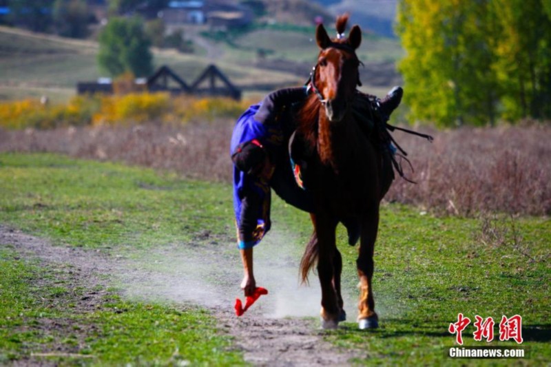 10月12日,在新疆伊犁州那拉提大草原,一场独居特色的民俗节目表演,吸引了众多游客前来观赏。哈萨克族作为马背上的民族,民俗表演自然大多和马有关,赛马、刁羊、姑娘追等马背上的精彩活动,展现了这个“马背上的民族”的万种风情。图为骑马捡硬币。中新社记者王小军 摄
