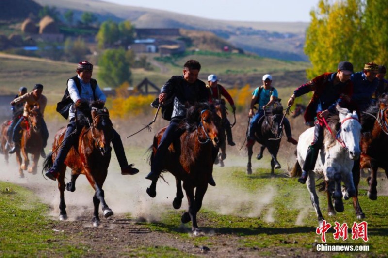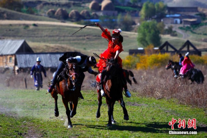 10月12日,在新疆伊犁州那拉提大草原,一场独居特色的民俗节目表演,吸引了众多游客前来观赏。哈萨克族作为马背上的民族,民俗表演自然大多和马有关,赛马、刁羊、姑娘追等马背上的精彩活动,展现了这个“马背上的民族”的万种风情。参加“姑娘追”活动的都是一对青年男女,骑马并辔,向前方数百米处指定地点进发,场面十分热闹。中新社记者王小军 摄