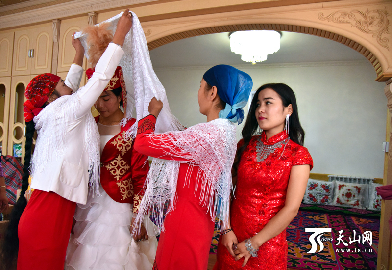 嫂子们给新娘穿民族嫁衣,佩戴首饰。