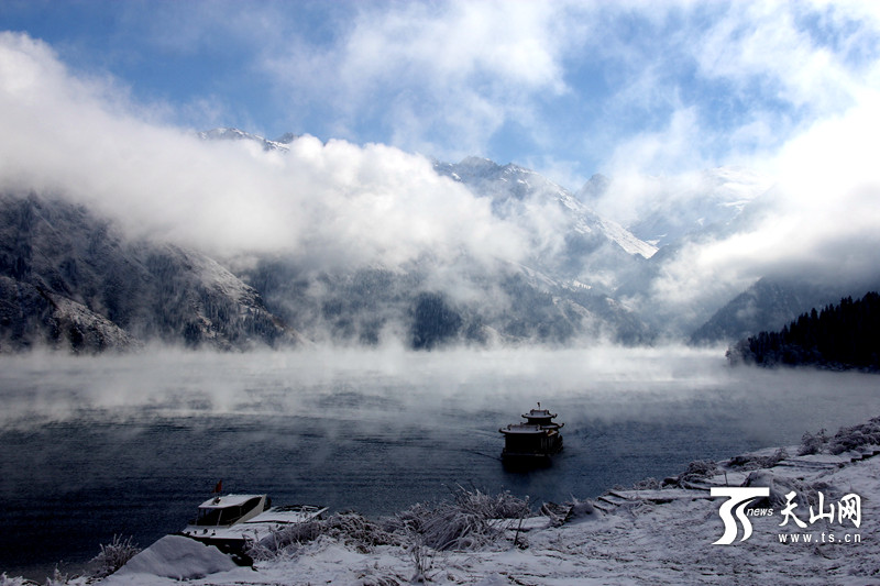 天山网讯(通讯员刘英摄影报道)仙境初临天池,魔雪飘落。漫游在步道,步步是景,帧帧如画,好像走进了冰雪世界,雪压枝低,草间银光闪现,冰梭映射阳光的色彩,呈现出了缤纷的世界;水面与空气接触的地方升起了一层白色的薄纱,微风拂过,轻姿曼妙。今日有缘得一见,宛王母来相会。