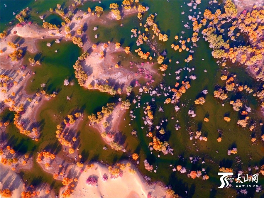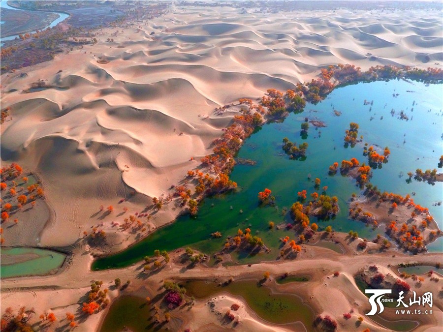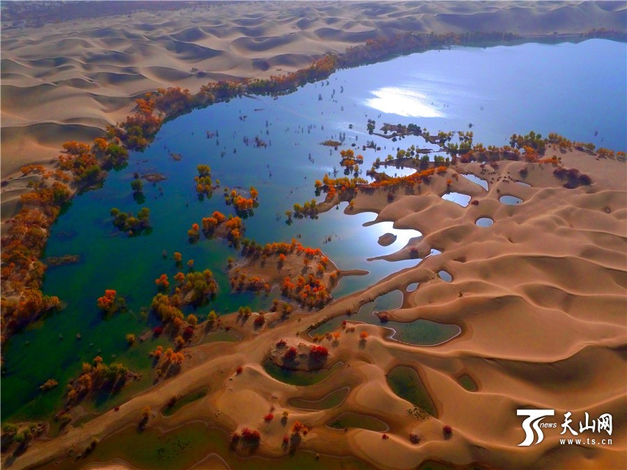 2016年10月30日,航拍的新疆尉犁县国家沙漠公园胡杨林景色壮美无限。