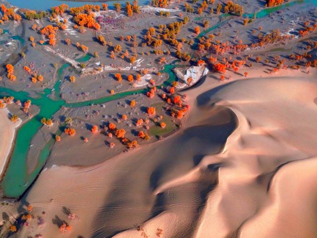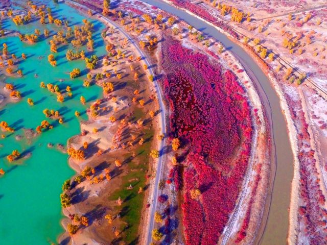 ?秋天来临,又到了胡杨林最灿烂的季节。2016年10月30日,摄影师来到新疆塔里木河畔,航拍了塔里木河尉犁县段的胡杨林,给我们带来大自然的震撼场景与绚丽色彩。摄影:CICPHOTO/确·胡热(据新华社客户端)