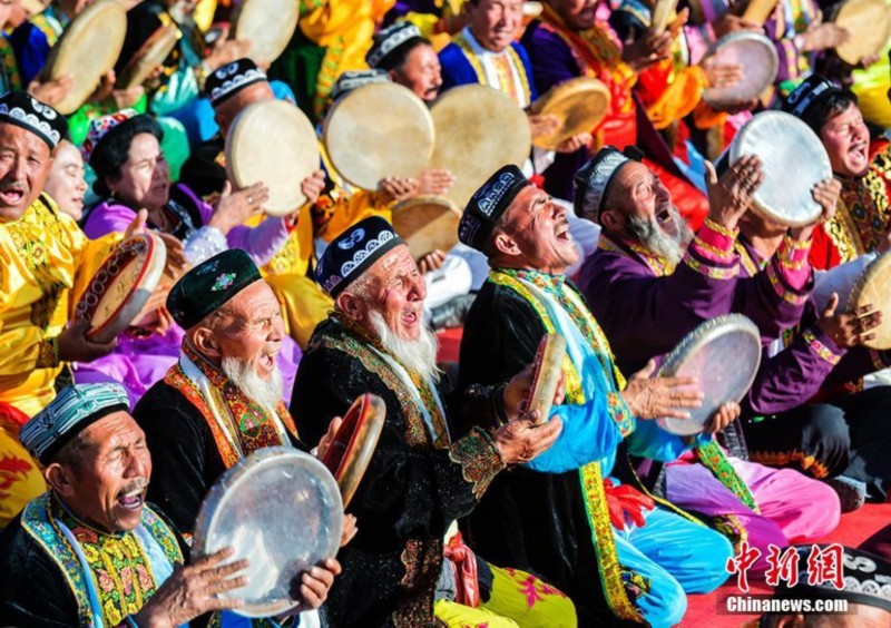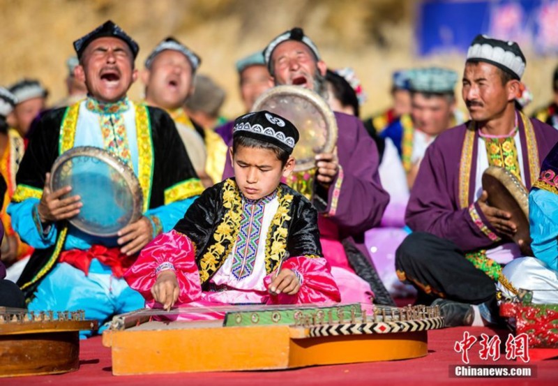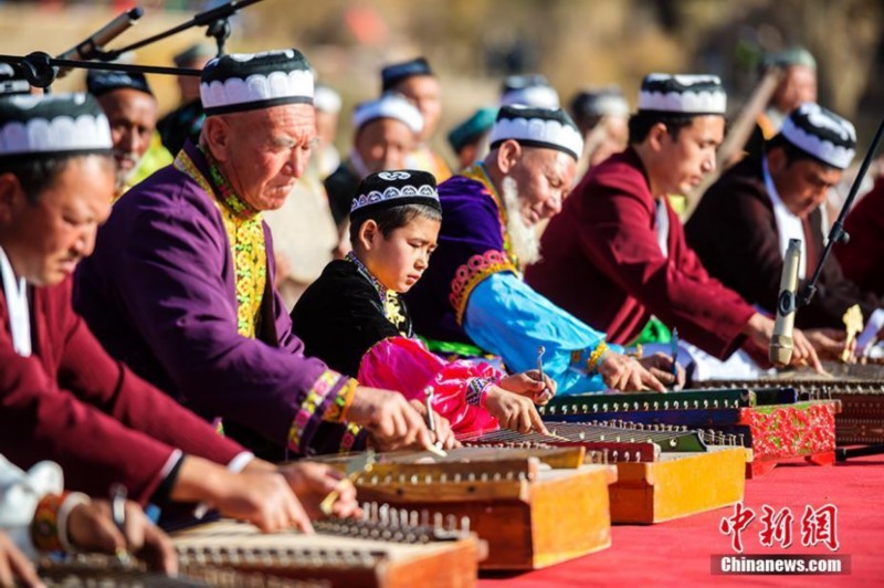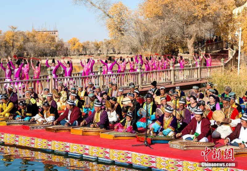 11月8日,新疆喀什地区巴楚县近150位民间艺人在叶尔羌下游河畔红海景区的胡杨林间弹起卡龙琴等乐器,激情演奏刀郎木卡姆乐章,当地千余名农民悠扬的乐声中跳起赛乃木舞蹈,吸引众多国内外游客前来观赏。据介绍,卡龙琴是维吾尔乐器中琴弦最多的古老弹弦乐器,古称七十二弦琵琶、“喀尔奈”,其发出的声音清脆悦耳,近似古筝,但比古筝的音色更明亮,是演奏维吾尔《十二木卡姆》不可缺少的乐器。金炜摄