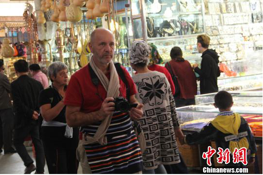 当日,记者巧遇意大利游客兰利尔(译音)一家人,他们在大巴扎里参观,买了3条丝巾。他告诉中新网记者,意大利的罗马和新疆的喀什都是古丝路上的重要城市,大巴扎让人感受到了古丝路的繁荣。