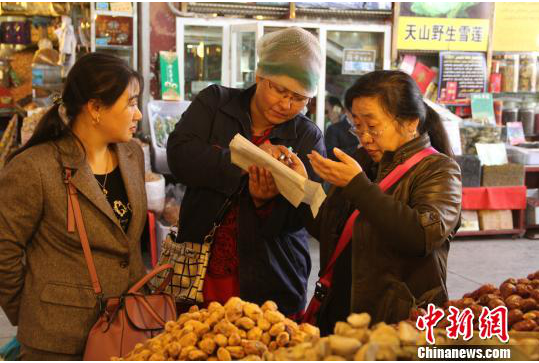 一大早,他刚开门,就迎来了熟客。在喀什五星级酒店银瑞林酒店工作的安徽人李玲带着几位来旅游的同乡买干果。平时,李玲受内地朋友之托代购干果,经常光顾此店。