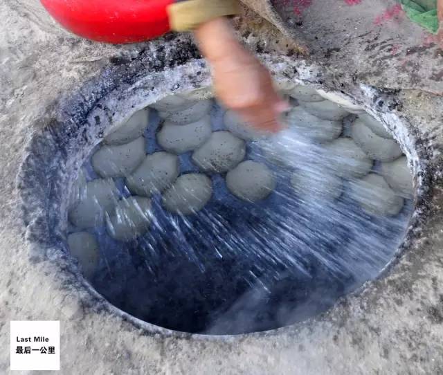 待所有烤包子全部粘好后,再次往坑中掸入大量盐水。