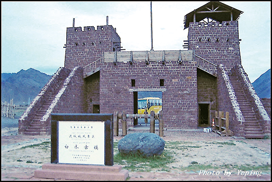 唐白水涧古城遗址依山势扼丝绸之路著名的白水涧道峡谷,建在一片灰黑色的山岩上,具有“一夫当关,万夫莫开”之险。