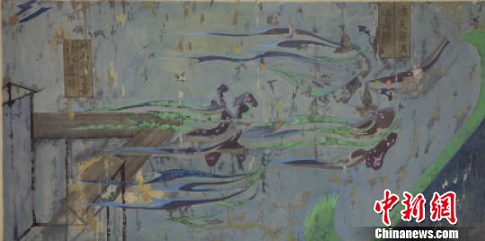 除麦积山石窟壁画外,展厅还展出了来自龟兹石窟的壁画。龟兹的壁画以别具一格的菱格形式的绘制佛教故事画为主,佛教故事画的题材和内容超过了印度和中国其他地区。本次展出的克孜尔石窟第171窟《券顶菱格因缘故事画》和第17窟《本生故事画》都是菱格故事画的代表。