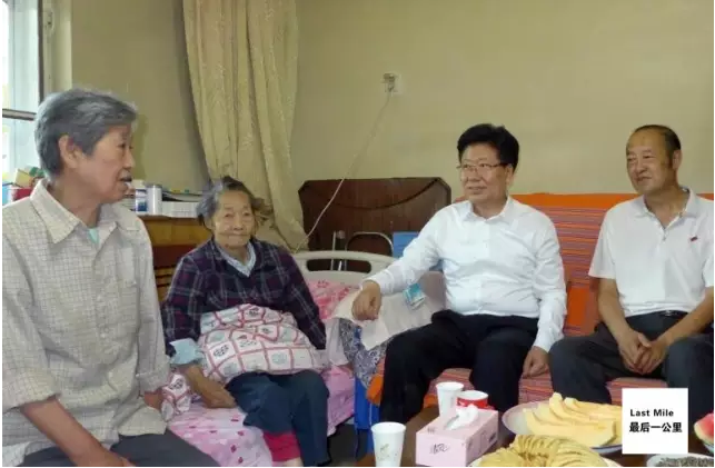 在和田驻乌鲁木齐第二干休所,张春贤看望了91岁的水利专家王蔚的遗孀马玉秀。张春贤俯下身子拉住她的手向她问好,并坐下来与家人一起回忆起王蔚的事迹。