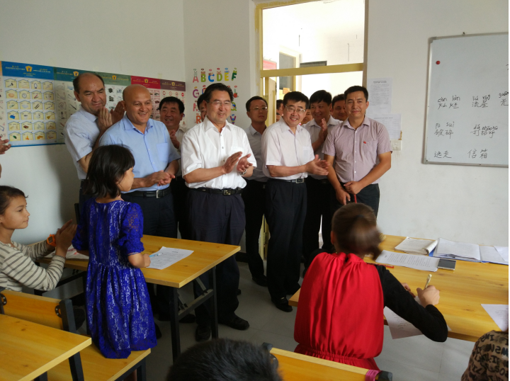 自治区政协副主席、自治区党委统战部部长程振山在洛浦县多鲁乡巴什艾日克村调研“双语”教育情况。(办公室)