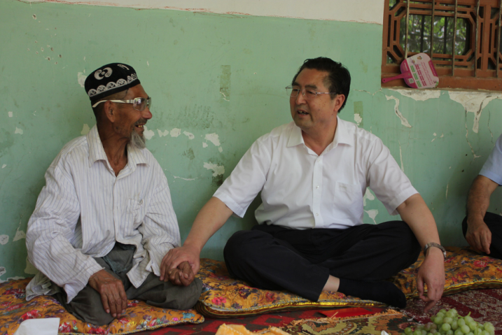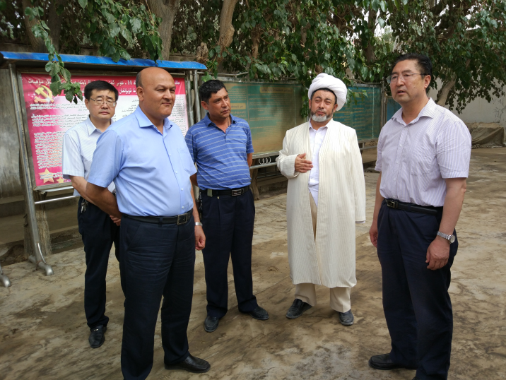 自治区政协副主席、自治区党委统战部部长程振山在策勒县策勒镇加曼清真寺,与该哈提甫亲切交谈。