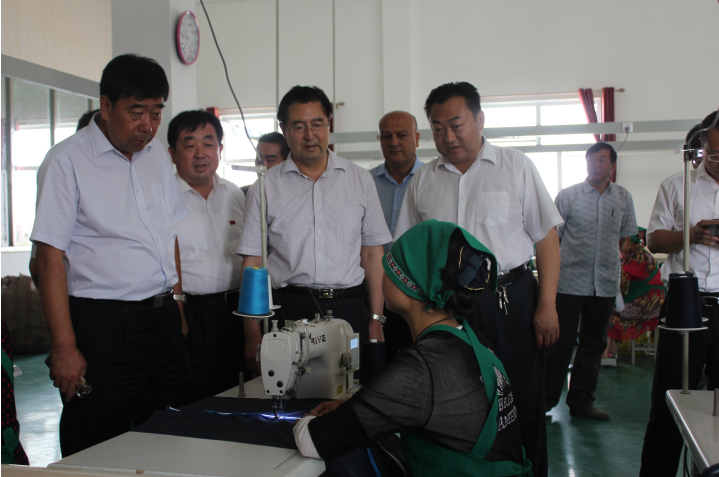 自治区政协副主席、自治区党委统战部部长程振山在民丰县创亿服饰有限公司,与少数民族员工亲切交谈。