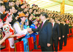8月18日晚,第五届全国少数民族文艺会演开幕式文艺晚会在北京人民大会堂隆重举行,习近平、李克强、俞正声、刘云山等党和国家领导人出席观看。演出开始前,习近平等会见了各民族演职人员代表。 □新华社记者姚大伟摄