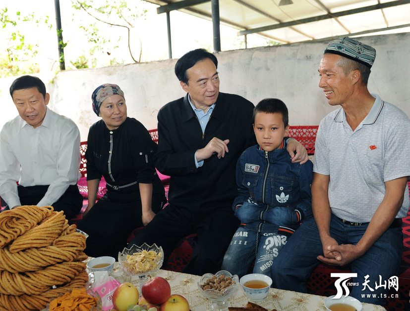 9月14日,自治区党委书记、新疆生产建设兵团党委第一书记、第一政委陈全国在昌吉市闽昌回民新村考察时,走进维吾尔族村民赛买江?木合买提的小院,祝赛买江全家人古尔邦节和中秋节快乐,并与他们围坐在一起,拉家常、谈生产、问生活。新疆日报记者卢民一摄?? ??