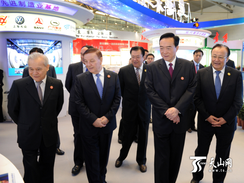 ?9月20日上午,全国人大常委会副委员长艾力更?依明巴海,全国政协副主席、全国工商联主席王钦敏在自治区党委书记、新疆生产建设兵团党委第一书记、第一政委陈全国陪同下在第五届中国—亚欧博览会展厅参观。新疆日报记者卢民一摄