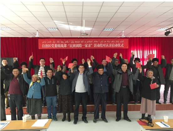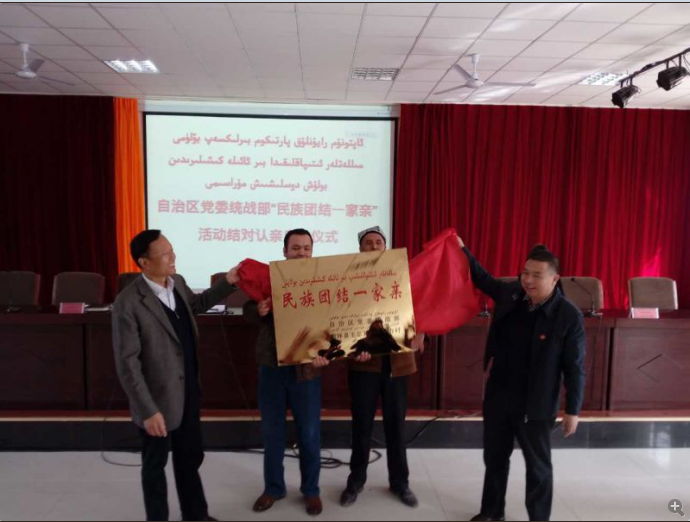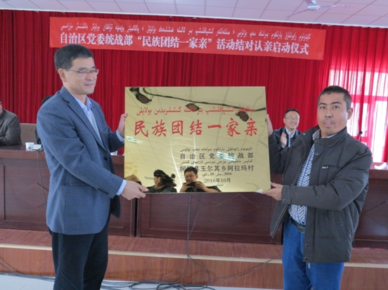 受自治区政协副主席、自治区党委统战部部长程振山委托,自治区党委统战部副部长刘新友、自治区纪委驻统战部纪检组组长王炯分别与柯坪县、乡领导共同揭开了“民族团结一家亲”的牌匾,并在讲话中指出,开展“民族团结一家亲”活动,是自治区党委贯彻落实以习近平总书记为核心的党中央治疆方略的一项重大举措。自治区党委统战部要坚决贯彻落实陈全国书记在自治区“民族团结一家亲”活动动员大会上的重要讲话精神,紧密结合实际,发挥自身优势,围绕了解情况、宣传政策、扶贫帮困、增进感情“四项重点”和熟悉家庭成员、赠送慰问品、照全家福、开展家庭宣讲、互留联系方式、考察家庭生活、互学日常用语、落实帮扶措施等“八项任务”,扎实开展活动。今天我们结对认亲,今后就要真心实意地把群众当亲人,手拉手、心连心,常联系、常走动,了解群众所思所想所盼,帮助解决实际困难,不断增进各民族血浓于水的团结情、兄弟情、姐妹情,共同为实现社会稳定和长治久安总目标打下最坚实的基础,共创幸福生活,共建美丽新疆,共圆祖国梦想!