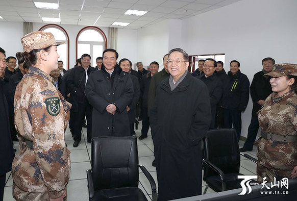 1月17日,中共中央政治局常委、全国政协主席、中央新疆工作协调小组组长俞正声在兵团十二师三坪农场民兵值班连,与值班民兵亲切交流,鼓励他们提高综合素质和训练水平,切实保障群众生产生活和社会稳定。新疆日报记者崔志坚摄